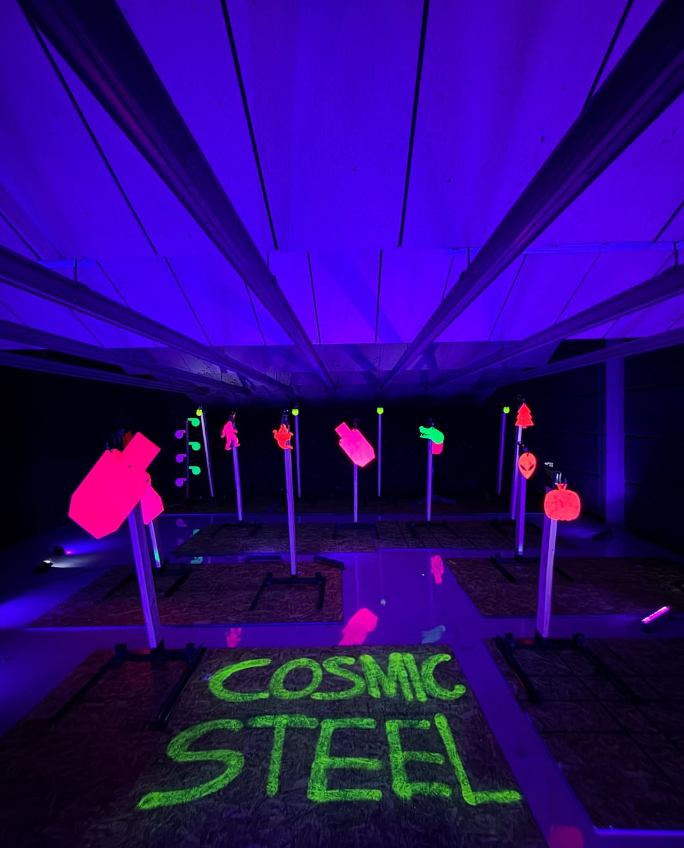 Steel Targets, Neon/Black Lights, Music and reactive frangible ammo.